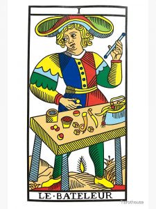 le BATELEUR, celui qui fait la démonstration de sa force en public sous couvert de légèreté. Maître de son microcosme plutôt que Maître du macrocosme. Inspiré par une connaissance supérieure.